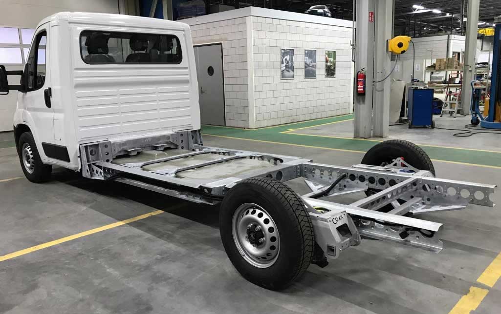 Low, lightweight chassis for the electric vans of the Stellantis Group, namely the Citroën Jumper-ë, Fiat e-Ducato, Opel e-Movano, and Peugeot e-Boxer. This chassis has long been available for the diesel versions of these models. The frame height is only 41 cm. Loading and unloading can often be done by stepping in/out of the vehicle, or with a hinged tail lift (without hydraulics). Additional benefits include a low center of gravity, effortless and fast loading and unloading, safer working conditions, a higher payload, and the ability to build large-volume containers.