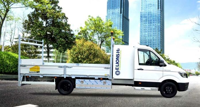 E-Lions Creator Pickup L4. Chassis with an open cargo bed, hydrogen drive, loading length approximately 375 cm, payload up to 1900 kg.