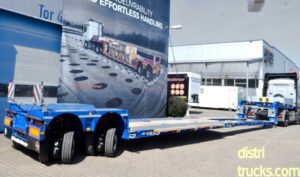 Standard features on this low loader are 8×2 lashing eyes of 13.4 tonnes, 3×2 of 10 tonnes, and 4×2 of 8 tonnes, which are neatly concealed on the side. Optionally, additional 13.4-ton lashing eyes built into the floor are available. Container locks for 40 ft or 2 x 20 ft container loads are also optional. Further options include: central lubrication, wireless remote control for the rear axles, a support frame for the loading platform, and front loading ramps. A metallization paint treatment is also available, providing even better corrosion protection.