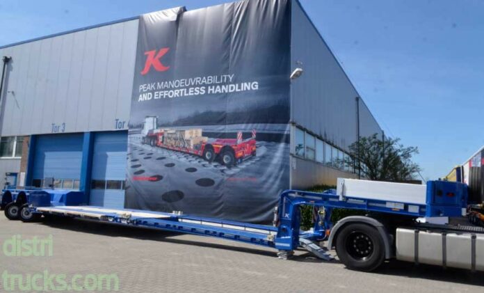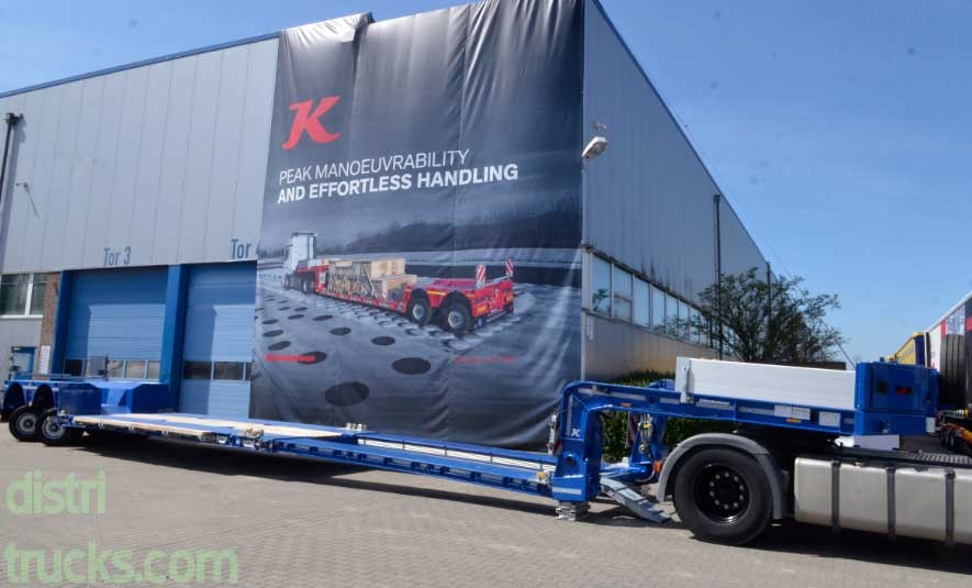 The K.SLL.P 2 is intended for the transport of large objects such as construction machinery, silos, and structural elements. The loading platform height above the road surface is 35 cm and the ground clearance is 10 cm in the lowest driving position. The gooseneck of this trailer can be uncoupled within five minutes for front loading. The lowbed extends by a maximum of 555 cm, to a maximum load length of 1230 cm.