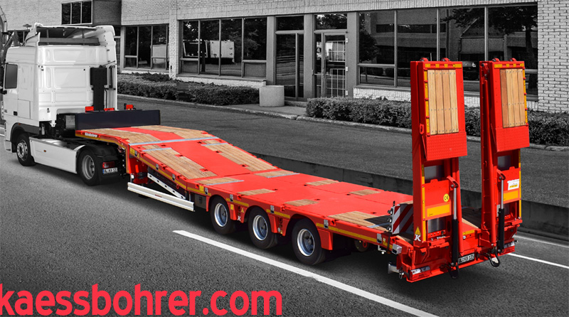 The non-extendable 3-axle Kässbohrer K.SLS HS 3 low-bed semi-trailer from Kässbohrer is equipped with a hydraulic gooseneck lift and a self-steering last axle, and is suitable for the safe and flexible transport of telehandlers, scissor lifts, forklifts, backhoe loaders, and asphalt milling machines.