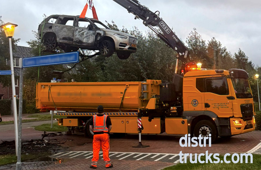 MAN 4×2 chassis configured as a recovery vehicle. A container can be placed on the ramp for the recovery of electric or hybrid cars, as shown in the photo. The wrecked car is then lifted into the container using the loading crane, a Fassi F245C. At the depot, the recovered car is submerged in water for 48 hours to cool.
