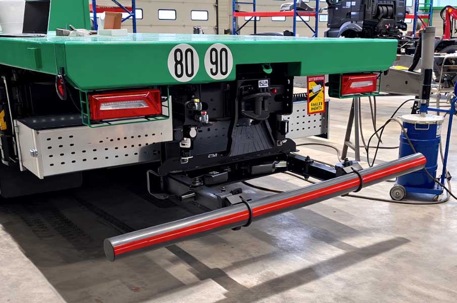 This underrun protection is also user-friendly for the driver. Operation is simple, and a light in the cab shows the position of the bar. An extendable rear bumper is often used on tippers and container handling systems. The Pommier E-Xpand is available in 13 versions and four extension lengths, from 400 to 1100 mm. For the bumper bar itself, there is a choice of two steel and two aluminium profiles: round, rectangular, or U-shaped. The U-variant can be equipped with rear light units if desired. The round bar is frequently chosen for tippers because less sand accumulates on it.