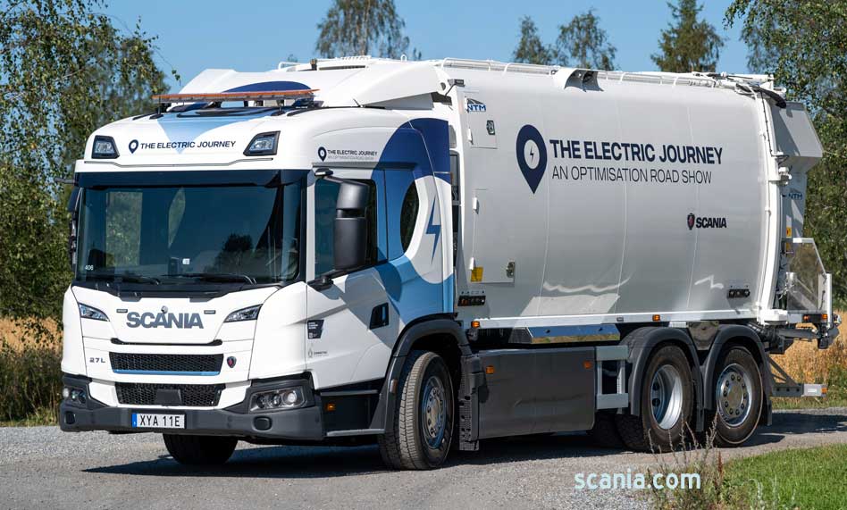 Electric version of the Scania L-series (with a low-entry cab), the truck designed to compete with the Mercedes-Benz Econic. In this chassis, the traditional diesel engine has been replaced by Scania’s EM 270 C1-4 electric motor. The rear axle is steered, making this Scania L very maneuverable. The example pictured has an NTM compactor, but this Scania is also suitable for urban distribution.